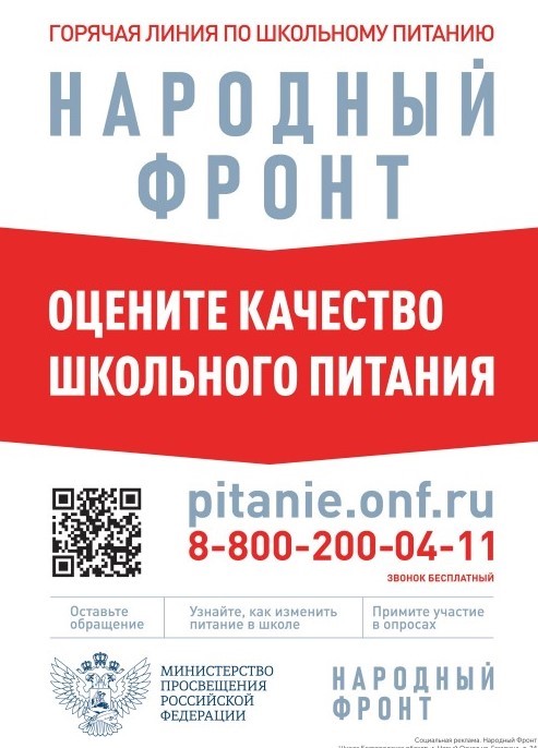 Общероссийским общественным движением «Народный фронт «За Россию» совместно с Минпросвещения России и АНО «Институт отраслевого питания» запущена горячая линия «Школьный завтрак» с целью контроля качества школьного питания.